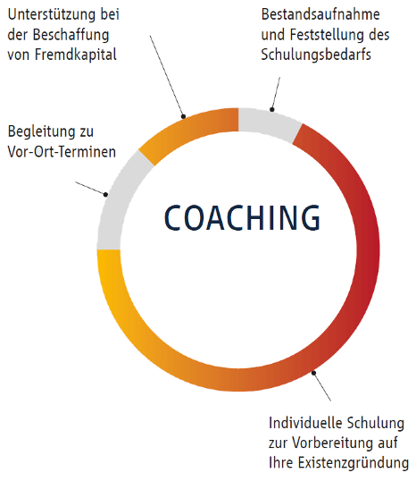 Ihre Gründungsidee steht im Fokus unseres Existenzgründungscoachings. Mit Hilfe Ihres persönlichen Coachs bereiten Sie Ihre Selbstständigkeit vor. Es wird ein Businessplan mit Finanzierungskonzept oder Marketingstrategie nach Ihren Bedürfnissen erstellt. Sie können dabei aus 25 verschiedenen Themenkomplexen, die für Sie passenden Inhalte wählen. Maximal können bis zu 120 Unterrichtseinheiten absolviert werden, je nachdem wie umfangreich Ihre Gründung und der benötigte Beratungsumfang ist.